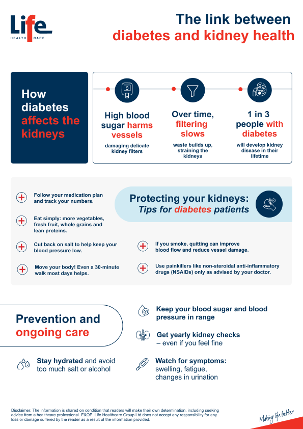 Diabetes is one of the leading causes of chronic kidney disease worldwide. Over time, high blood sugar can quietly damage the small blood vessels that help your kidneys filter waste and balance fluids. This limits your kidneys’ ability to clean the blood and regulate body fluids. Click here to download an infographic, which explains how diabetes can affect your kidneys and how to manage and mitigate the damage.